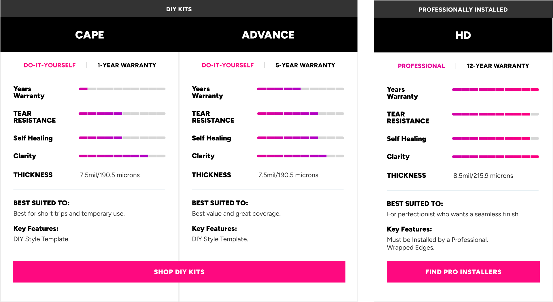 BushWrapz HD needs to be installed by a professional installer due to the templates being slightly different. Being that BushWrapz HD is a 10 year warranty film and ultimately going to be on your vehicle for 10+ years, these templates have been created to ensure a very custom and seamless look where possible. This requires bulking and trimming, therefore, not something we would recommend anyone DIY-ing.
